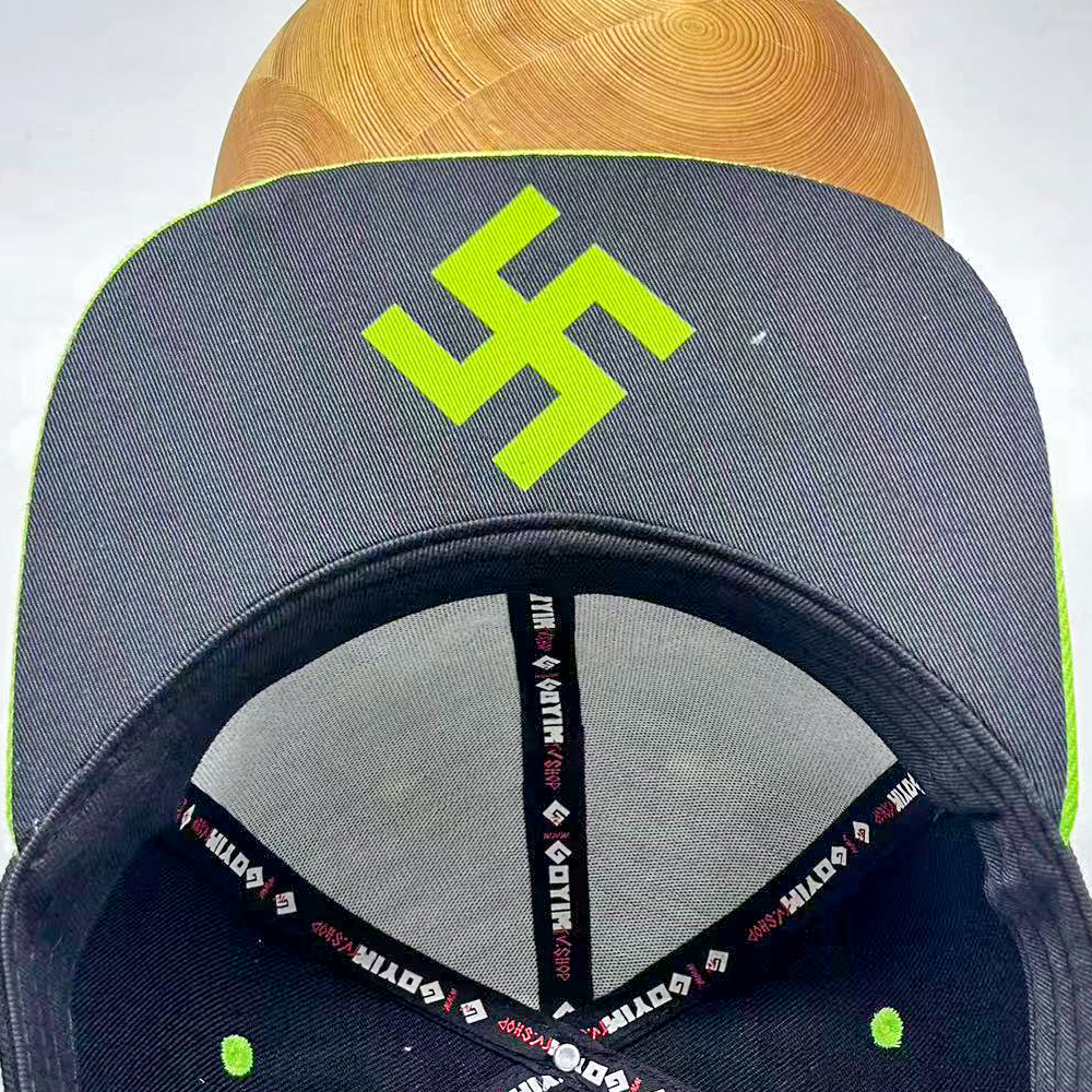 This stylish black hat features a prominent stitched neon green Swastika symbol.